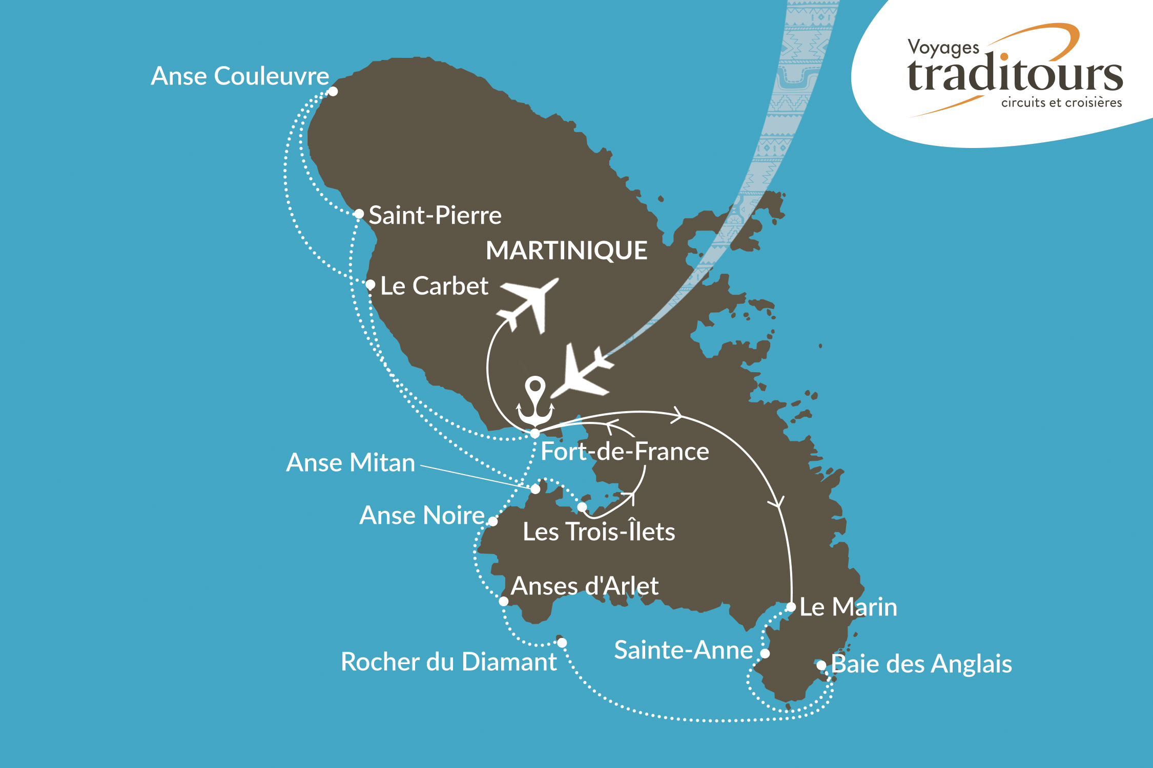 Rencontre à l’aéroport de Montréal avec notre accompagnateur Traditours et assistance aux formalités d’enregistrement. Envol à destination de Fort-de-France, en Martinique. Accueil à l’aéroport et transfert à la marina du Marin. Embarquement et installation dans notre cabine à bord du catamaran. Réunion d'information et présentation de l'équipage et des consignes de vie à bord. En fin d’après-midi, nous levons l’ancre pour une courte navigation d'une heure. Nous profitons déjà d’une première soirée bercée par les eaux chaudes des Caraïbes et la douceur des alizés. Cocktail de bienvenue au coucher du soleil où nous passerons la nuit à Sainte-Anne. Souper et nuit à bord du catamaran.