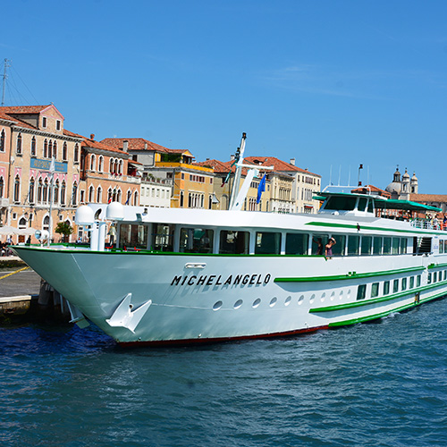 Le MS Michelangelo navigue sur la lagune de Venise et le long du Pô. Ce bateau est doté de plusieurs ponts, et d’un pont soleil avec chaises longues permettant d’apprécier confortablement les paysages qui défilent durant la croisière. Les cabines, quant à elles, sont toutes équipées de douche et de toilettes, d’une télévision, sèche-cheveux et coffre-fort. Les 78 cabines sont réparties sur 2 ponts. 4 ancres - Inauguré en 2000 - Rénové en 2017 - Capacité : 154 passagers