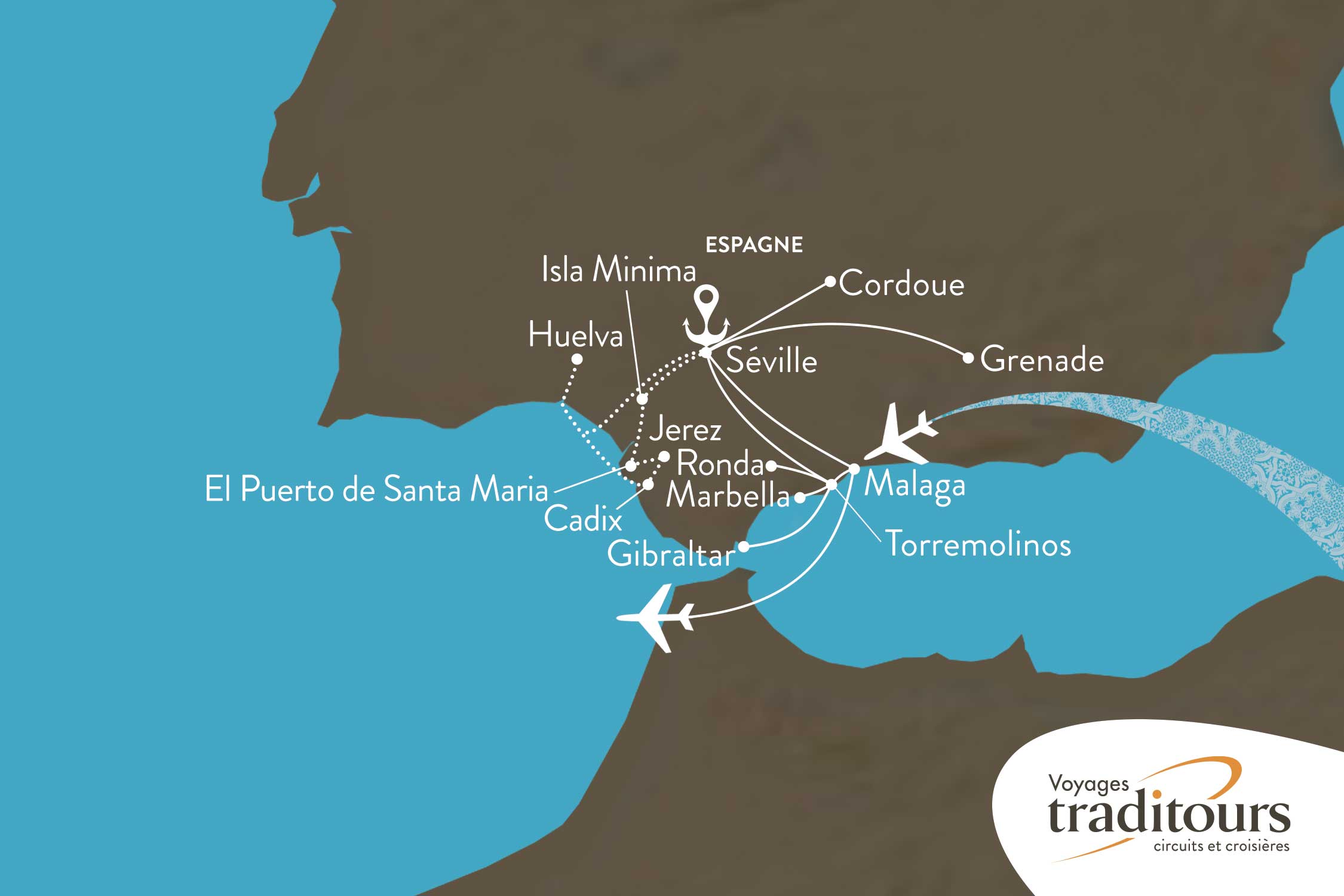 Déjeuner à bord. Départ en autocar vers Jerez. Nichée au cœur de l’Andalousie, Jerez est renommée pour son vin de Xérès, ses chevaux andalous et son flamenco. Un tour de ville nous permettra de découvrir les principaux monuments. Puis nous visiterons l’Alcazar. Cet ancien palais fortifié datant du 9e siècle témoigne de l’héritage musulman de la ville. Dans ses dépendances, magnifiquement restaurées, se trouvent la mosquée christianisée, sous l’invocation de Santa María la Real, les Bains Arabes, le Moulin à Huile et les paisibles jardins. Enfin nous visiterons la majestueuse cathédrale, un chef-d'œuvre architectural qui allie styles gothique, baroque et néoclassique. Nous poursuivrons par une dégustation de vins dans une bodega. Retour à bord pour dîner et navigation vers Cadix. En après-midi, départ en autocar pour un tour panoramique de Cadix. Nous apercevrons la richesse culturelle et historique de cette ville ainsi que la beauté de sa baie. Le vieux centre rassemble les quartiers les plus typiques de la ville, il possède de superbes églises baroques et d’élégantes demeures seigneuriales dont un bon nombre s’orne de façades peintes de délicates couleurs pastel et de balcons ouvrages en fer forgé. Nous visiterons également la cathédrale, magnifique édifice de style baroque et néoclassique. Souper à bord et départ à pied pour une soirée flamenco. Le flamenco est un art créé par le peuple gitan et andalou, sur la base d’un folklore populaire issu des diverses cultures qui s’épanouirent au fil des siècles en Espagne. Retour au bateau en fin de soirée. Navigation de nuit.