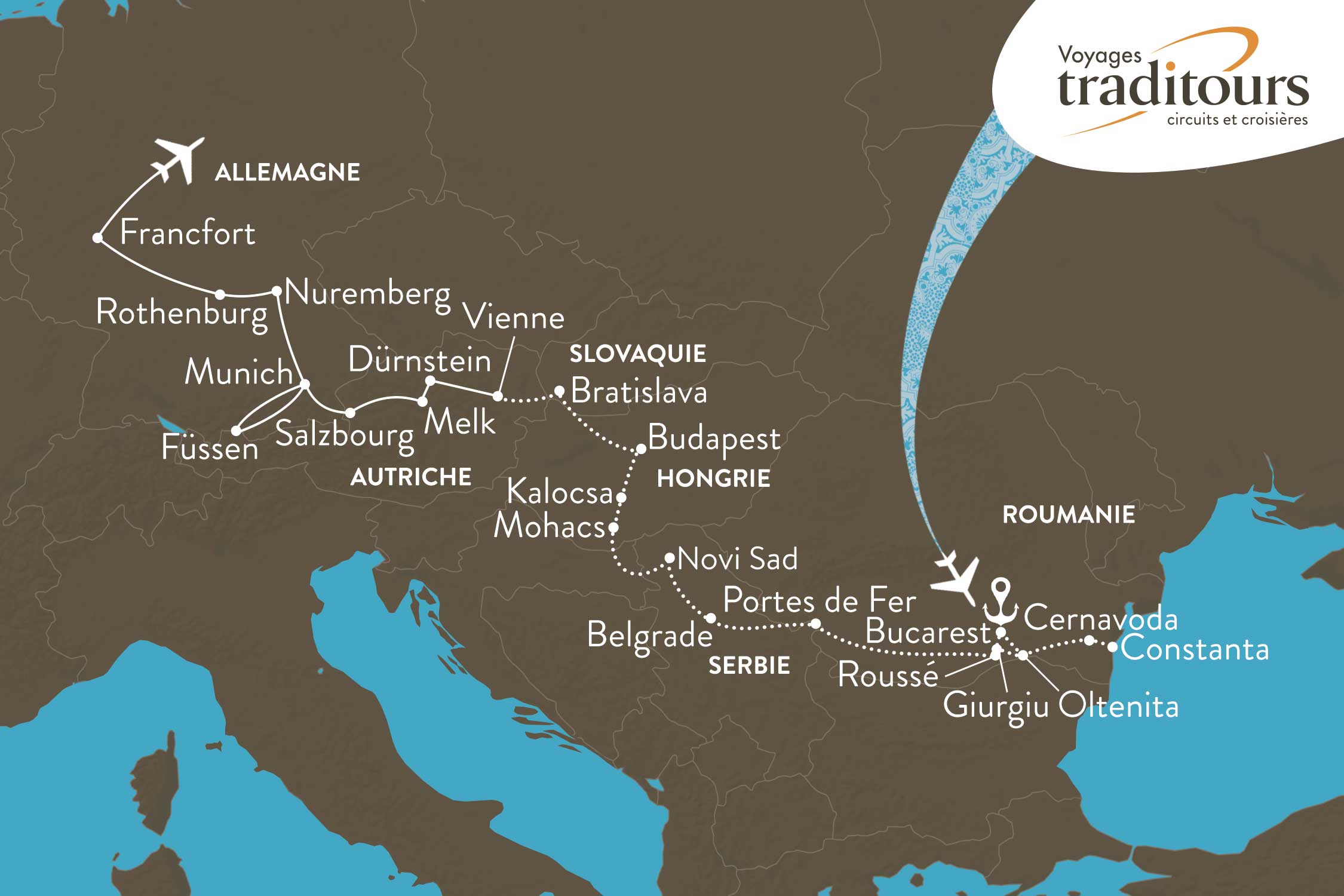 Incluant les plus belles villes des 7 pays du bassin danubien et des nuitées à Bucarest, Salzbourg, Munich, Nuremberg, Rothenburg et Francfort