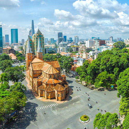 Visite de la capitale économique du Vietnam, Saïgon, maintenant appelée Hô Chi Minh-Ville. Nous débuterons la journée avec la visite du quartier chinois, du temple de la Dame céleste et du marché Binh Tray. Cette ville très dynamique en plein essor compte plus de quatre millions de motos et scooters en tous genres. Dîner dans un restaurant local avant de continuer la visite avec un arrêt au cœur de l’ancienne Saïgon où l’on retrouve les bâtiments coloniaux français les plus importants, notamment l’église du Sacré-Cœur de Tan Dinh, très caractéristique avec sa couleur rose et la poste centrale conçue par nul autre que Gustave Eiffel. Nous continuerons notre chemin vers le palais de la Réunification autrefois connu sous le nom de palais de l’Indépendance, pour ensuite faire la visite de la pagode de l’Empereur de Jade, surtout reconnue pour ses gravures en bois et sa population de tortues.