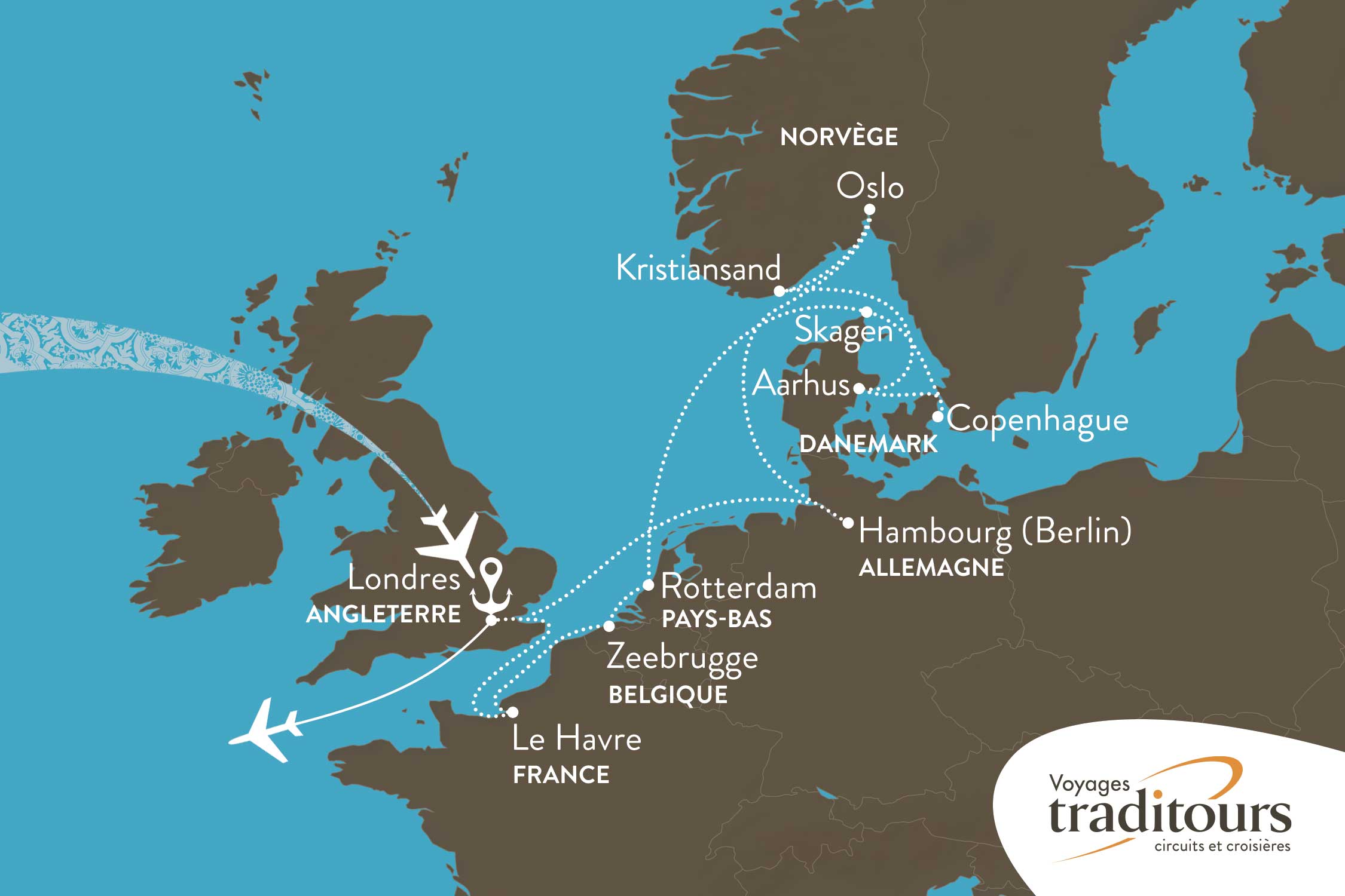 NOTES : Ce programme a été établi longtemps à l’avance en fonction des impératifs locaux connus. Des modifications peuvent donc survenir en raison de divers facteurs opérationnels, logistiques ou toute autre raison hors du contrôle de Voyages Traditours. Les compagnies de croisière se réservent le droit d’ajuster l’ordre des escales, de remplacer une destination ou d'adapter la durée des arrêts en fonction notamment des conditions de navigation et météorologiques. Ces changements peuvent être nécessaires en fonction des exigences portuaires, des décisions des armateurs ou d’autres impératifs jugés essentiels au bon déroulement du voyage. Voyages Traditours se réserve aussi le droit d’apporter des ajustements au programme, afin de garantir la meilleure expérience possible.