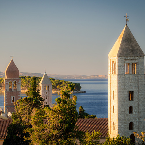 Nous partirons à la découverte de la cité médiévale de Rab, ceinte de remparts du XIIᵉ siècle et célèbre pour ses quatre campaniles qui dominent l’horizon. Fondée à l’époque romaine, Rab se dresse majestueusement à l’entrée d’une baie pittoresque, offrant un panorama saisissant dès notre arrivée. Notre visite débutera au parc Komrčar, véritable havre de verdure orné de pins d’Alep et d’essences méditerranéennes, aménagé par le forestier Pravdoje Belija le long des anciens murs de la ville. Nous plongerons ensuite dans l’histoire captivante de Rab, de ses origines romaines à sa splendide cathédrale Sainte-Marie, joyau de l’art médiéval. Le clocher emblématique et l’architecture harmonieuse de la cité se dévoileront au fil de la promenade. Nous conclurons cette découverte par une dégustation du célèbre gâteau de Rab, une douceur ancestrale créée à l’époque vénitienne. Jadis réservée aux familles patriciennes, cette spécialité demeure aujourd’hui un symbole gourmand du patrimoine local.