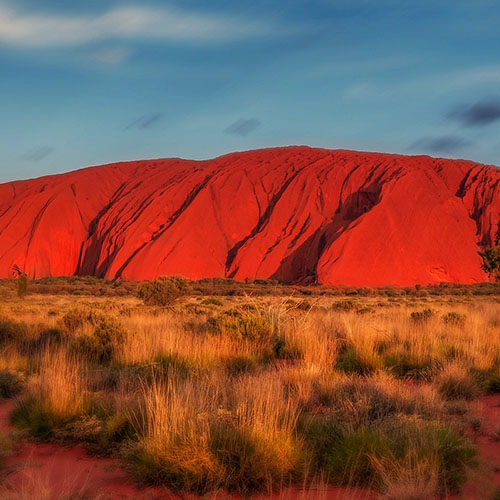 Déjeuner. Transfert à l’aéroport de Melbourne. Envol pour Ayers Rock. Accueil par notre guide-chauffeur francophone et transfert vers notre hôtel. Dîner et départ pour une excursion vers le site de l’impressionnant monolithe d’Uluru, qui se dresse au centre du fabuleux désert rouge. Ce monolithe de 3,6 km de long, mondialement connu, surgit à 348 m au-dessus du plateau de sable. Sa couleur change selon son exposition au soleil, passant par toute une gamme de rouges avant de virer au gris au crépuscule. Ensuite, nous ferons une promenade guidée à Uluru en empruntant le chemin de Mala, qui nous mènera jusqu’à la gorge de Kantju et plus encore. Nous y évoquerons les croyances mythiques des anciennes tribus Anangu. Visite du Centre culturel aborigène. Enfin, nous prendrons l’apéritif au coucher du soleil tout en contemplant la splendeur du monolithe. Souper en plein air, accompagné de musique aborigène et commentaires sur les étoiles de l’hémisphère Sud. Retour et nuit à Uluru.