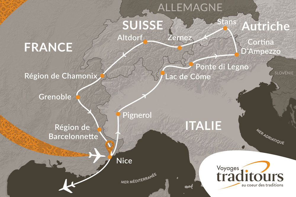 Rencontre avec notre accompagnateur de l’équipe Traditours à l’aéroport de Montréal. Assistance aux formalités d’enregistrement et envol à destination de Nice, ville de Provence située au sud-est de la France. Repas et nuit à bord.