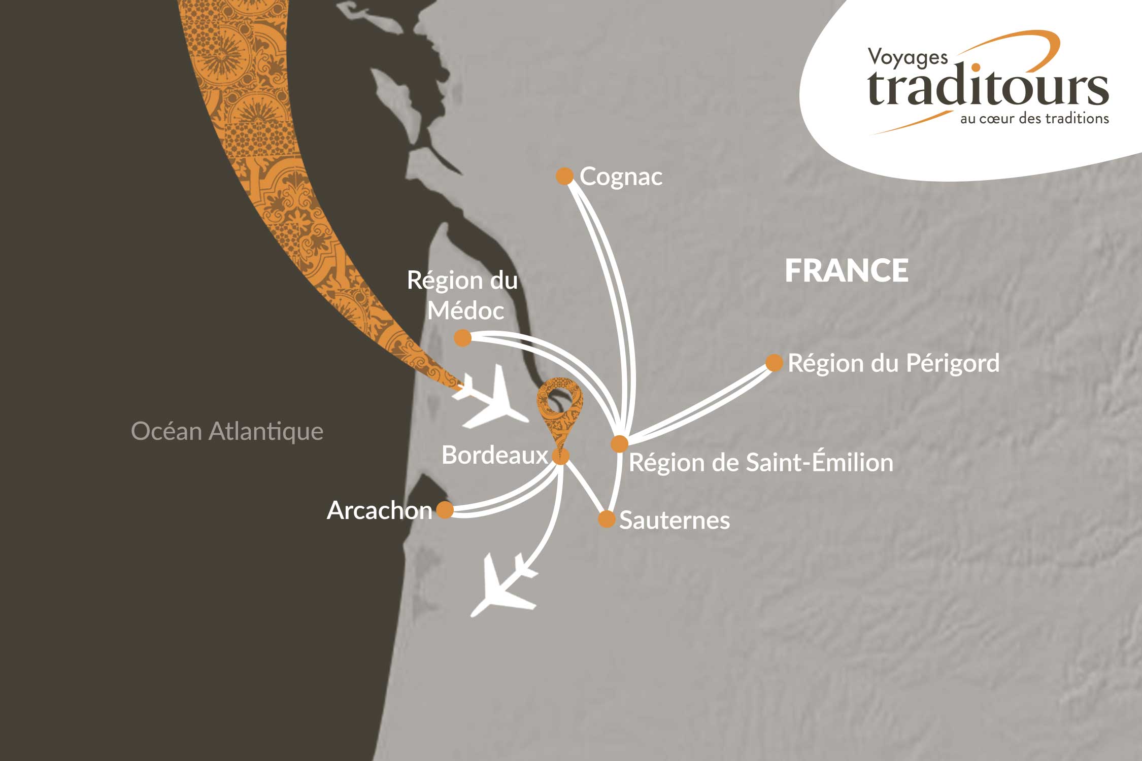 Rencontre avec notre accompagnateur Traditours à l’aéroport de Montréal. Assistance aux formalités d’enregistrement et envol à destination de Bordeaux.