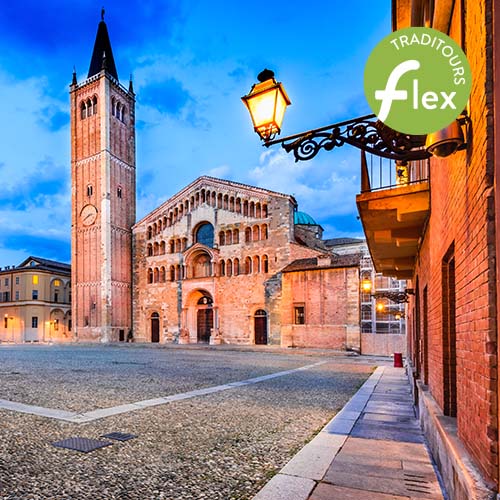 - Visite guidée à pied du centre historique incluant la cathédrale Santa Maria Assunta, l’abbaye Saint-Jean-l’Évangéliste, le Teatro Regio, la basilique Santa Maria della Steccata, le Palais du Gouverneur dominant la Piazza Garibaldi, le monumental complexe de la Pilotta et le baptistère
